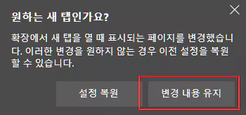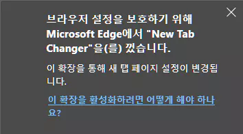 MS의 입장에서는 이 플러그인에 의해 새 탭의 기본 페이지가 자신들의 페이지가 아닌 다른 사이트로 변경되게 되므로 못마땅할게 뻔합니다. 그래서 팝업을 띠워 '설치는 되었지만 기능은 꺼두었으니 키는 건 알아서 해라'라는 의미입니다.