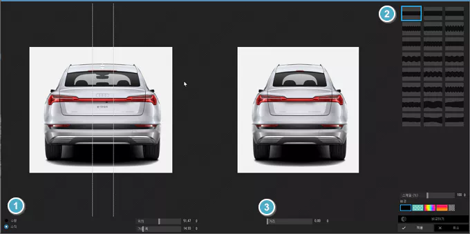 크기를 조절할 e-tron Sportback 후면 이미지를 불러온 다음 우측 편집 메뉴에서 변형 > 가위를 클릭합니다.