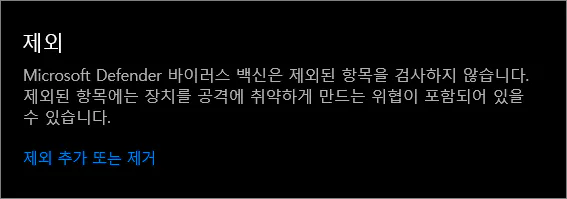 - 다음 창에서 가장 아래쪽으로 슬라이드 바를 내리면 '제외' 항목이 있습니다. '제외' 항목에 있는 '제외 추가 또는 제거'를 클릭합니다.