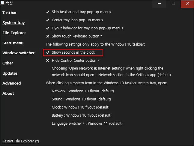 아래의 이미지는 윈도우 작업 표시줄의 시간 표시에 초단위를 설정하는 버튼을 표시합니다.