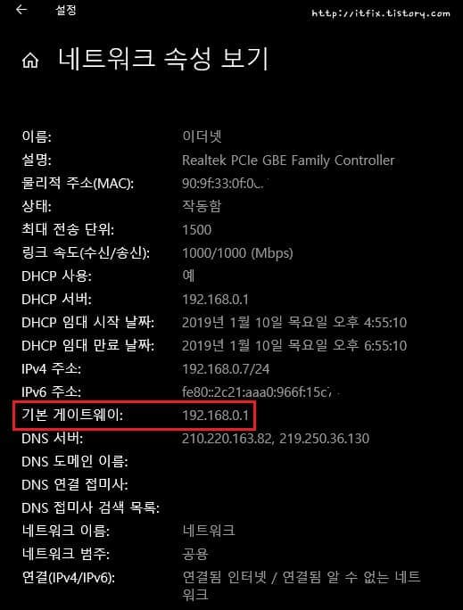 진짜 외부 IP주소를 보려면 SK모뎀으로 들어가봐야겠습니다. 먼저 공유기 속으로 들어가 보겠습니다. PC에서 공유기로 들어가기 위해서는 공유기의 주소를 알아야 하는데, 그럴러면 윈도우즈 설정>네트워크 속성 보기로 들어갑니다. 그러면 랜카드 이름, 전송속도 등이 나오는데 그 중에서 기본 게이트웨이 주소가 공유기의 주소가 되겠습니다.