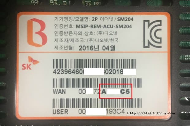 아래의 SK브로드밴드 모뎀 밑면에 붙어 있는 스티커 내용중 가운데 줄 WAN의 넘버 중 뒤의 굵은 글씨로 써진 6자리가 "123456_admin"처럼 암호가 되는 것입니다.