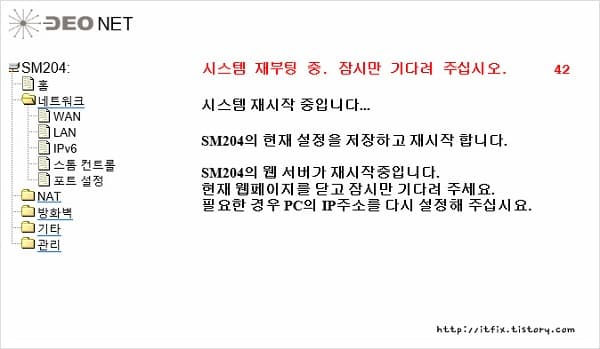 리부팅을 시작하는 화면입니다. 이 화면이 SK 브로드밴드 모뎀을 초기화하기 전까지는 마지막으로 볼 수 있는 관리자 화면의 모습입니다.