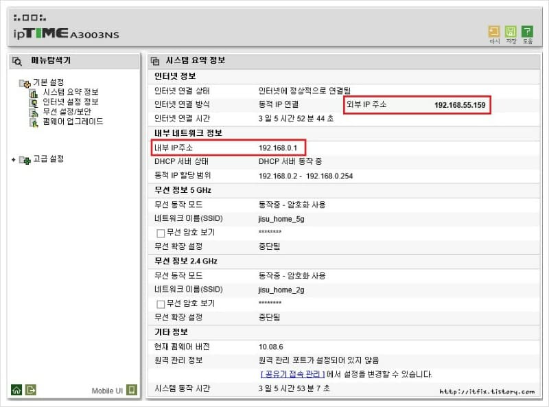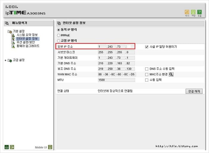 이제 다시 IP TIME 공유기의 관리자 화면으로 진입해 봅니다. 192로 시작하는 사설 IP 주소가 아닌 외부 IP 주소를 받고 있음을 확인 할 수 있습니다. 결론적으로 외부에서 PC에 접속해서 작업해야 할 일 있거나, 서버를 운영해야 하거나, 원격작업이 필요할 경우에는 위와 같은 방식으로 SK 브로드밴드의 모뎀을 브릿지 모드로 바꾸어야 직접 유무선 공유기로의 진입이 가능해 집니다.