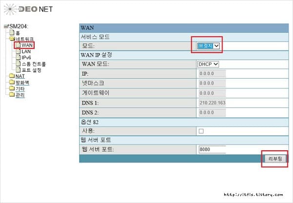이제 마지막으로 SK 브로드밴드의 공유기 기능을 끄기 위해 네트워크의 WAN설정에서 브릿지 모드로 바꾸어 줍니다.