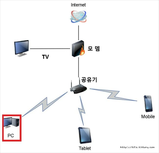 저의 PC는 두 단계의 공유기환경을 거쳐서 인터넷이 PC에 들어옵니다. 일차로 들어오는 인터넷은 통신회사인 SK브로드밴드의 모뎀을 지나면서 1차 방화벽을 지나고, 다시 2차로 IP TIME 공유기의 방화벽을 지난 뒤 저의 PC로 들어옵니다. 간략히 도식화 해보면 다음과 같습니다. 이 그림은 이전에 포스팅 했던 draw.io Diagrams for Confluence 을 이용해 그려봤습니다.