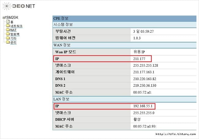 이렇게 SK모뎀에 로그인하게 되면 아래와 같은 화면이 뜨는데 211.177로 시작하는 외부IP를 받고 모뎀 자신에게는 192.168.55.1을 할당하고, 192.168.55.159는 IP TIME 공유기에게 할당했습니다.
