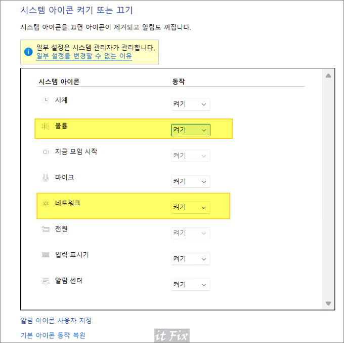 작업 표시줄 우측 끝 부분의 알림 영역에는 윈도우 디펜더와 한영 전환을 비롯해 볼륨, 네트워크, 전원 등의 시스템 트레이용 아이콘이 들어가 있습니다. 그런데 어느 순간 볼륨이나 네트워크, 전원 아이콘들이 보이지 않고 윈도우 작업 표시줄 설정에서도 비활성화되어 있어 아이콘을 켜는 것이 불가능한 경우가 있습니다.