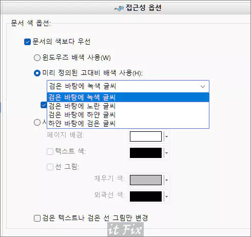 이렇게 하면 그 아래에 있는 옵션인 정의된 고대비 배색 옵션이나 사용자 배색 옵션을 사용할 수 있게 됩니다.