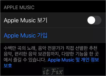 아이폰의 설정 > 음악 > Apple music 항목으로 간 다음 애플 뮤직 관련 설정을 모두 꺼줍니다. 이 작업과 함께 애플 뮤직에 로그인되어 있었다면 로그아웃까지 진행해 주도록 합니다.