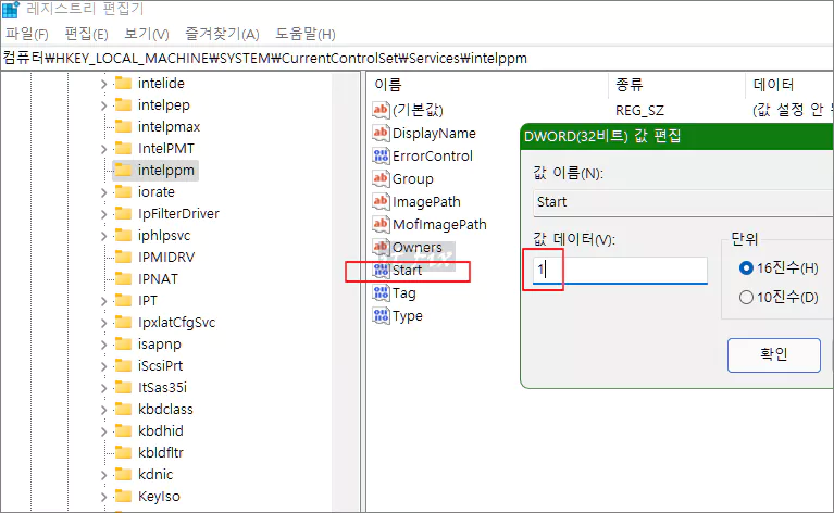 intelppm 우측의 항목 중 start를 더블 클릭한 다음 값 데이터를 1로 수정해 줍니다.