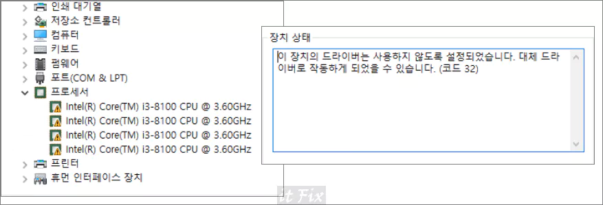 장치관리자 인텔 cpu 느낌표 오류 코드 32 해결 방법