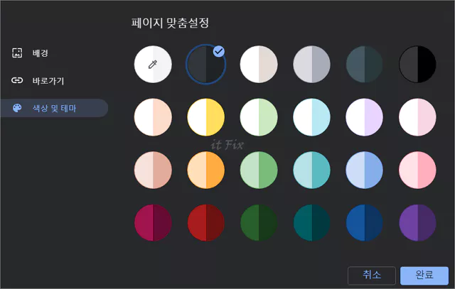 크롬의 색상 및 테마를 설정할 수 있는 부분으로 첫번째 색상 아이콘을 선택하면 사용자가 직접 색상을 선택하여 설정할 수 있으며 이렇게 선택된 색상으로 탭 표시줄의 색상이 설정되게 됩니다.