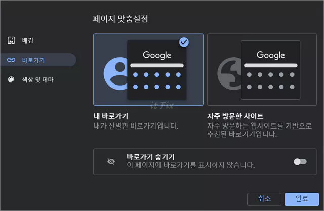 크롬 시작 페이지의 하단에 최대 10개까지 설정 가능한 바로가기 아이콘들은 사용자가 직접 10개를 구성하여 사용하거나 또는 최근 자주 방문하는 사이트들로 자동으로 구성되게 설정할 수 있습니다. '내 바로가기'를 선택하면 10개의 바로가기를 내가 직접 설정하고 고정시킬 수 있으며, 우측의 '자주 방문한 사이트'를 선택하면 크롬 브라우저에서 자동으로 자주 방문하는 사이트를 구성하게 됩니다.
