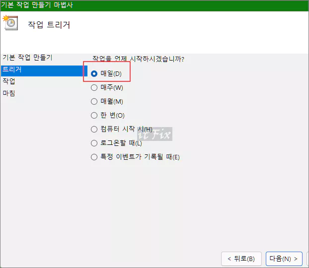 매일 일정한 시간에 컴퓨터를 종료해야 하므로 작업은 매일이 선택된 상태에서 하단의 다음 버튼을 눌러 줍니다.