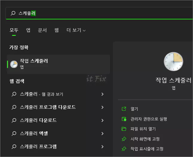 윈도우 작업 표시줄 시작 버튼 옆의 검색 상자에 스케줄러라고 입력한 다음 작업 스케줄러를 클릭해 실행합니다.