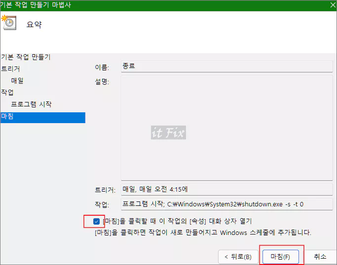이어서 마침 항목에서 하단의 속성 대화 상자 열기에 체크한 다음 마침을 눌러 줍니다.