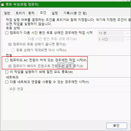 다음으로 조건 탭을 선택하고 전원 부분의 체크 표시를 해제합니다.