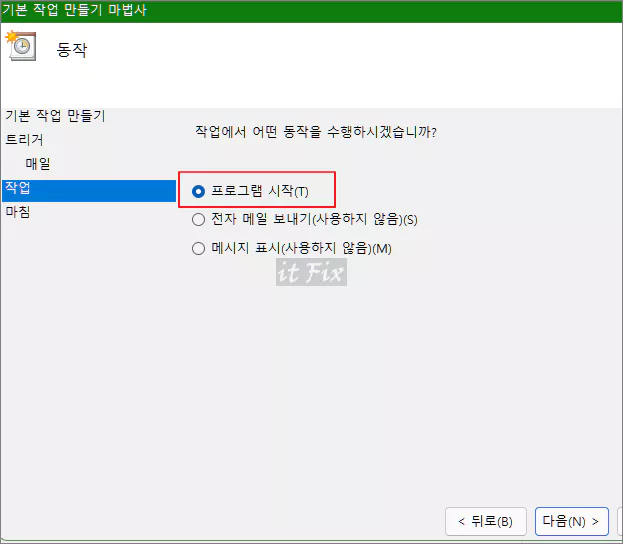 작업 내용으로는 윈도우 시스템 파일인 시스템 종료 실행파일을 실행할 것이므로 프로그램 시작을 선택해 주고 다음으로 넘어갑니다.