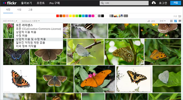 개인 또는 사진작가들이 사진의 공유 또는 보관을 목적으로 많은 사진을 업로드하며 이를 다운로드할 수 있습니다. 그냥 사용해도 보통은 문제가 되지 않는 경우가 대부분이지만 걱정되신다면 1차 이미지 검색후 상단의 모든 라이선스를 클릭하고 원하는 옵션을 선택해서 범위를 더 좁혀서 사용할 수 있습니다.