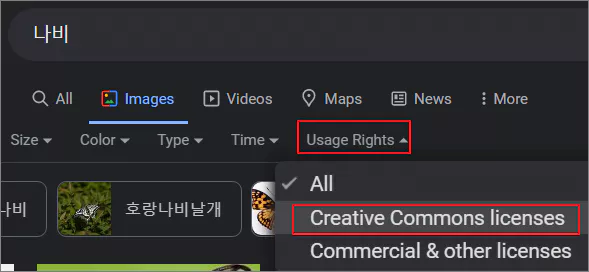 Images 메뉴 아래로 나타난 메뉴중 Usage Rights를 클릭하면 다시 그 하부 메뉴로 Creative Commons Licenses 및 Commercial & other Licenses가 나타나게 되는 데, CCL을 선택하게 되면 자유롭게 사용이 가능한 이미지 결과만 남게 됩니다.