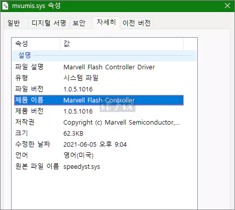 mvumis.sys 파일은 윈도우 시스템 파일로 원본 파일 이름은 speedyst.sys이며 이 파일은 Mavell Flash Controller Driver입니다. 2022년 1월 현재의 이 파일 버전은 1.0.5.1016입니다. 저작권은 마블 반도체에 있으며 마블 반도체 컨트롤러 드라이버 파일로 분류됩니다.