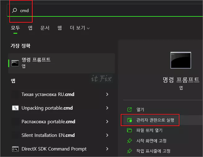 윈도우 작업 표시줄 시작 버튼 옆의 검색상자를 클릭한 다음 cmd 라고 타이핑 한 다음 명령 프롬프트를 관리자 권한으로 실행합니다.