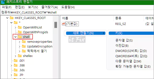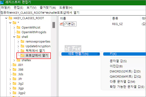 3. 우측 창에서 마우스 우클릭한 다음 새로운 키값으로 이름이 '포토샵에서 열기'라는 값을 만들어 줍니다.