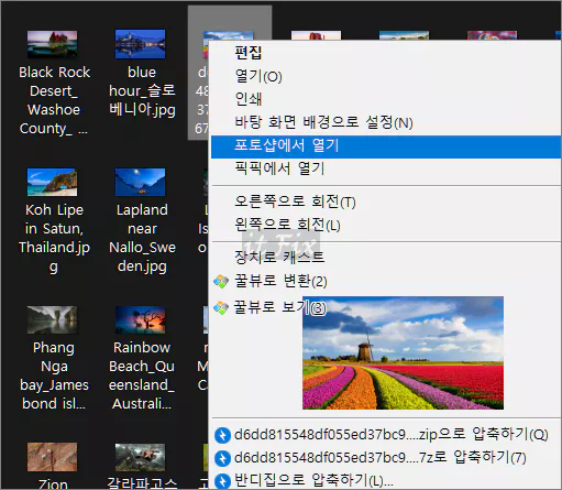 6. 이제 어떤 이미지든 마우스 우클릭한 다음 포토샵에서 열기 메뉴를 선택하여 해당 이미지를 포토샵에서 바로 열 수 있습니다.