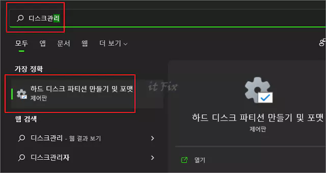 디스크 관리자를 실행하려면 윈도우 작업표시줄 시작 버튼 옆의 검색 상자에 '디스크관리'라고 타이핑한 다음 '하드 디스크 파티션 만들기 및 포맷'을 클릭하시면 됩니다.