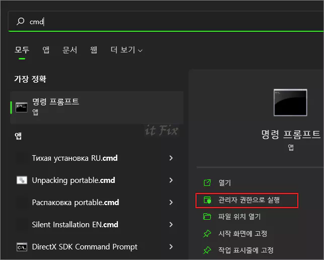 작업 표시줄의 시작 버튼 옆의 검색 상자에 CMD를 입력한 다음 관리자 권한의 명령 프롬프트를 실행합니다.