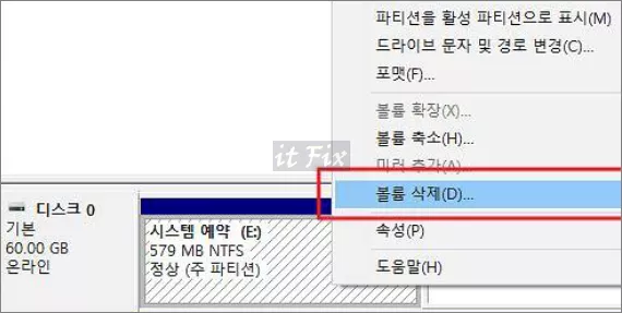 이전과는 다르게 예약 파티션의 속성에서 활성이 사라져 있으며, 마우스 우클릭 후 볼륨 삭제가 가능한 상태가 되어 있습니다. 우클릭 후 볼륨 삭제를 누릅니다.