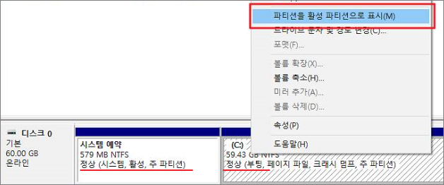 먼저 디스크 관리자로 들어가서 부팅 파티션으로 설정되어 있는 C 드라이브 등을 마우스 오른쪽 버튼을 눌러 해당 파티션을 활성 파티션으로 표시해야 합니다.