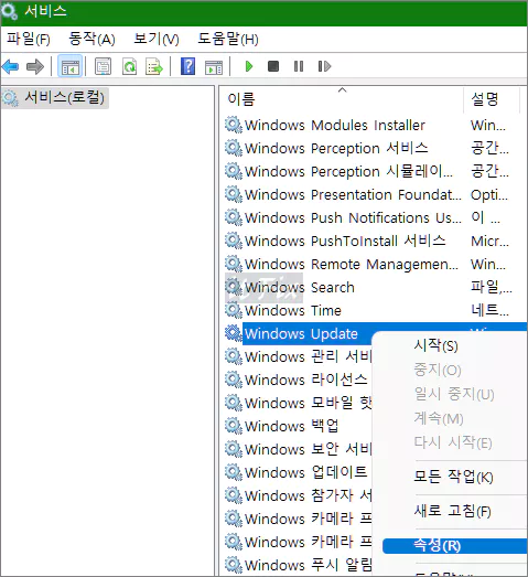 서비스 앱이 실행되면 우측의 서비스 항목 중 Windows Update 항목을 찾아 마우스 우클릭한 다음 속성을 클릭합니다.