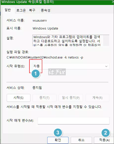 Windows Update 속성 창에서 시작 유형을 자동으로 변경한 다음 하단의 적용 및 확인 버튼을 눌러 줍니다.