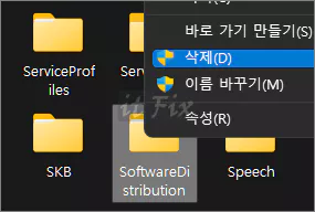 SoftwareDistribution 폴더를 마우스 우클릭한 다음 통째로 폴더를 삭제합니다.