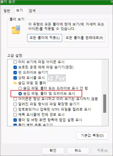 파일 탐색기를 연 다음 폴더 옵션의 보기 탭을 선택합니다. 그다음으로 숨김 파일 표시 부분이 선택되어 있어야 합니다.