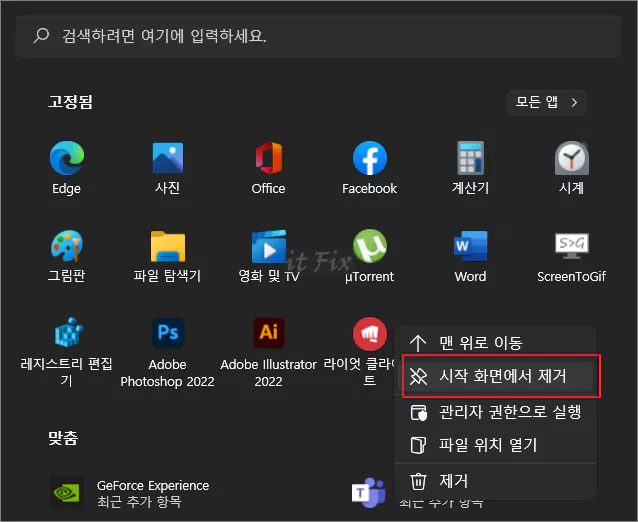 윈도우 시작 화면에 고정의 의미, 시작 화면에서 삭제
