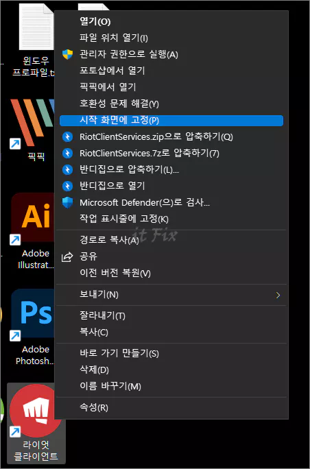 예를 들어 아래의 이미지에서와 같이 라이엇 클라이언트를 마우스 우클릭한 다음 시작 화면에 고정을 선택하게 되면 바로 가기 아이콘이 윈도우 시작 버튼 시작 화면 영역에 생기게 됩니다. 윈도우 11 형식의 우클릭 메뉴를 윈도우 10 형식으로 변경하려면 이전 포스팅에서 소개해 드렸던 ExplorerPatcher를 설치하면 됩니다.