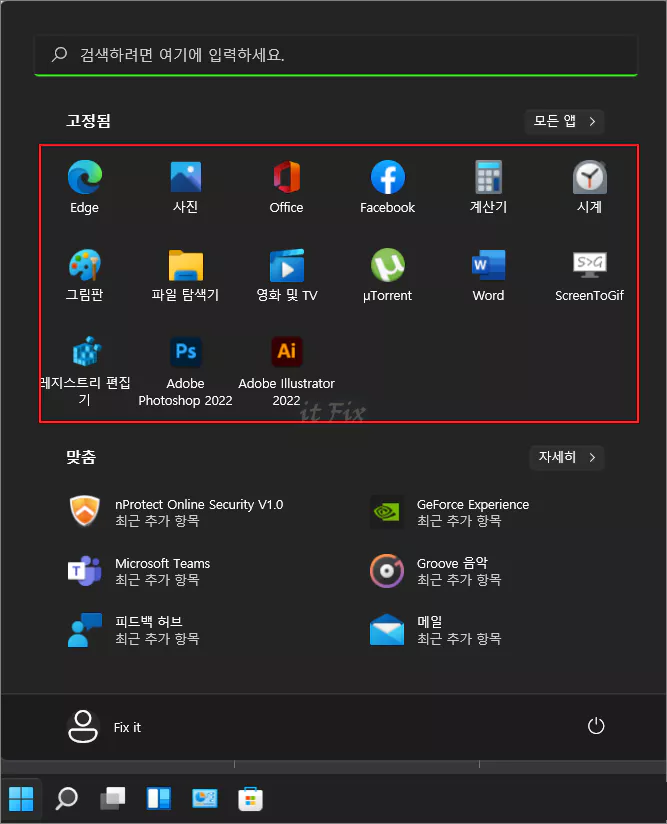 윈도우 11의 경우에 시작 화면 영역은 아래의 이미지에서처럼 작업 표시줄에 있는 시작 버튼을 눌렀을 때 팝업 되는 시작 화면 영역에서 상단에 위치하는 부분입니다.