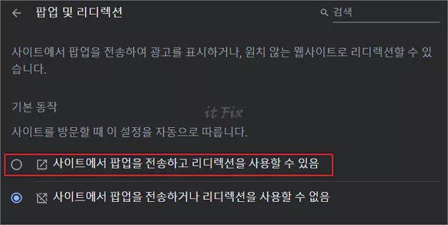 이 페이지에서 팝업 및 리디렉션 기본 설정을 '사이트에서 팝업을 전송하고 리디렉션을 사용할 수 있음'으로 변경해 줍니다.