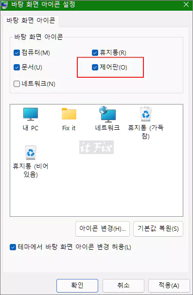 제어판에 체크한 다음 적용 및 확인 버튼을 누르면 바탕 화면의 제어판 아이콘이 다시 보이게 됩니다.