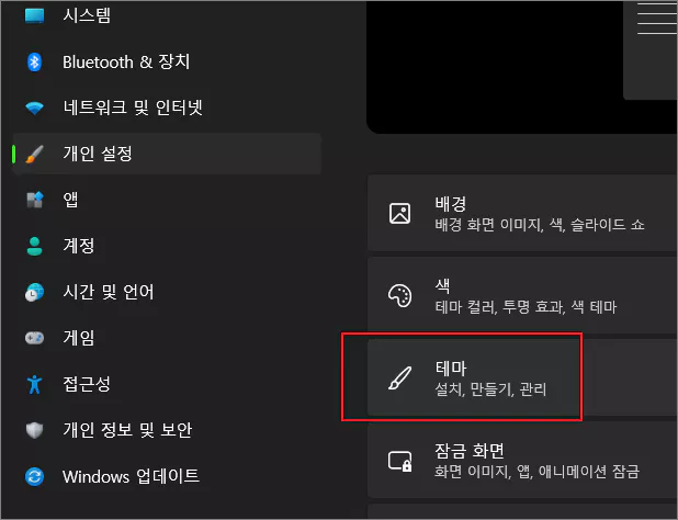 다음으로 테마 설정 페이지에서 바탕 화면 아이콘 설정을 누릅니다.