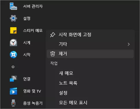 윈도우 시작 버튼을 누르고 스티커 메모 바로 가기를 마우스 우클릭한 다음 제거 메뉴를 클릭하여 삭제합니다.