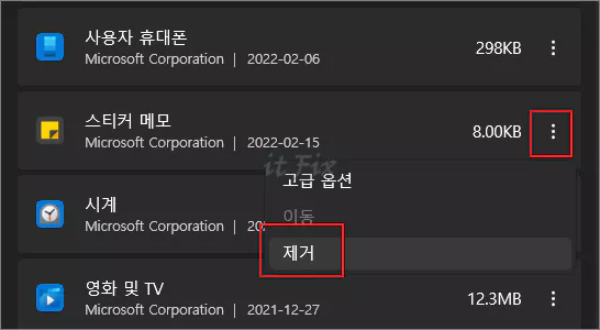 윈도우 설정 > 앱 > 앱 및 기능으로 들어간 다음 전체 앱 목록에서 스티커 메모 앱을 찾았다면, 우측에 있는 점 3개를 클릭한 다음 팝업 메뉴에서 제거를 선택해 줍니다.