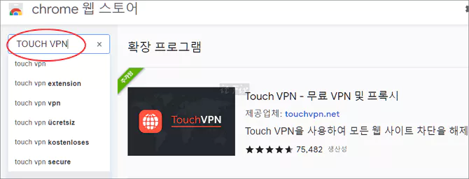 3. 크롬 웹 스토어에서 TOUCH VPN을 검색한 다음 TOUCH VPN 크롬 확장 프로그램 아이콘을 누르고 크롬에 추가하기 버튼을 눌러 설치합니다.