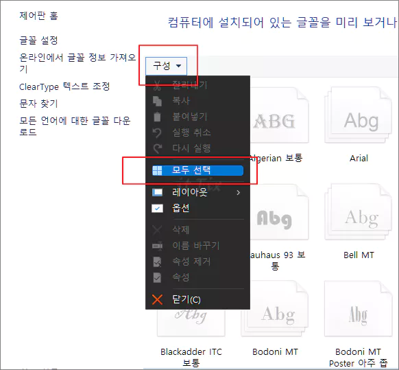 이번에는 제어판의 글꼴 페이지에서 상단의 드롭다운 메뉴인 구성을 클릭한 다음 모두 선택을 클릭해 줍니다.