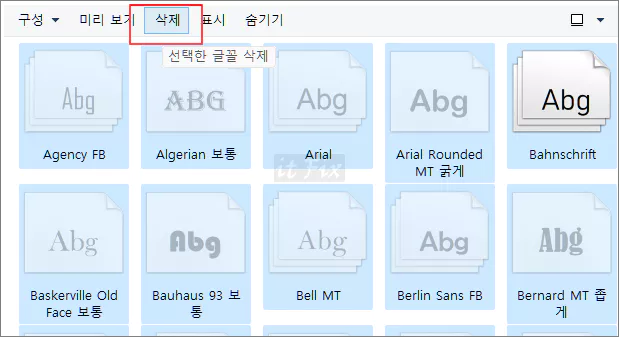 모든 글꼴이 선택된 상태에서 상단의 삭제 버튼을 눌러 줍니다.