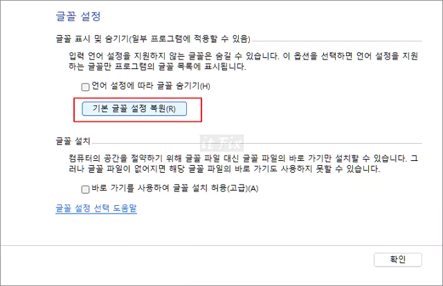 글꼴 설정 페이지가 열리면 기본 글꼴 설정 복원 버튼을 클릭합니다. 이렇게 하면 바로 위에 있는 '언어 설정에 따라 글꼴 숨기기' 옵션이 자동으로 체크되면서 적용되게 됩니다.