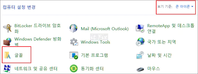 윈도우 글꼴을 기본값으로 초기화시키고자 할 경우에는 제어판을 연 다음 위쪽 상단의 보기 방식을 큰 아이콘으로 바꾼 다음 글꼴 아이콘을 클릭합니다.